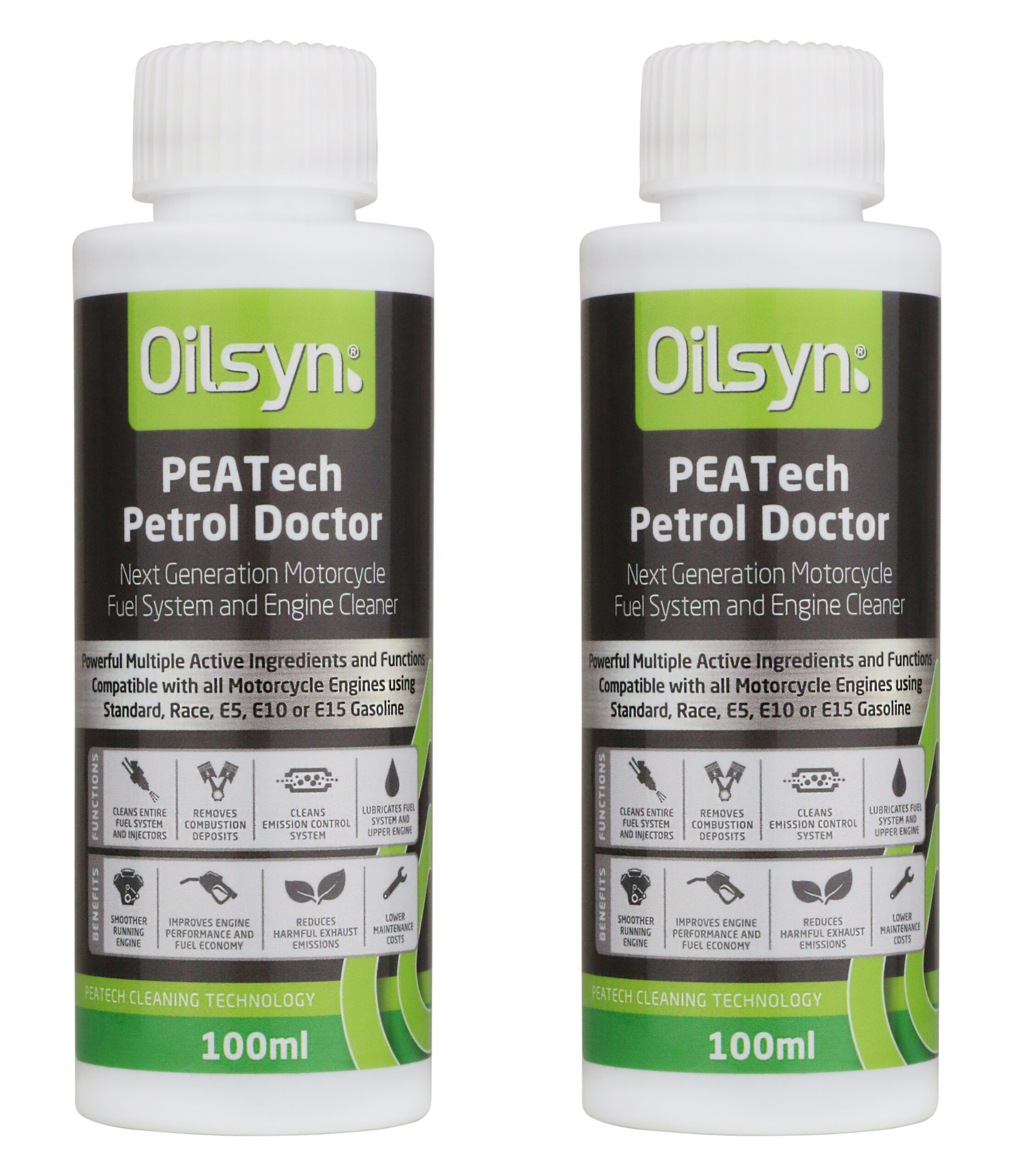 Oilsyn PEATech Petrol Doctor uses a proprietary formulation of active polyetheramines combined with a new dedicated Fuel Injection detergent to safely remove deposits from the fuel system and engine.